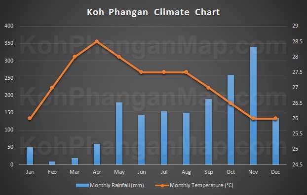 The Koh Phangan weather and climate chart below is based on average rainfall and temperature levels for the Surat Thani region of Thailand.